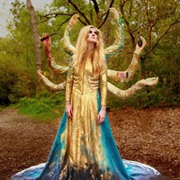 A costume designed to suit 'the crazy curiosities of the creature carnival', this costume incorporates the characteristics of two iconic women; women born from Gods whose identities are entwined. Pandora from Greek mythology and Kali the Hindu Goddess of Death. Each arm represents an evil of the world.